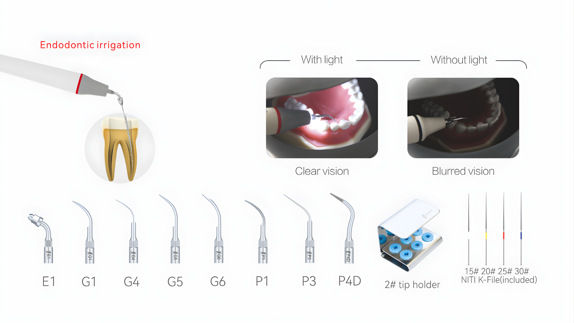 - Antiseptic inner water pipe, allowing use of special liquids like hydrogen peroxide, chlorhexidine, and sodium hypochlorite, enhancing periodontal and root canal treatments*